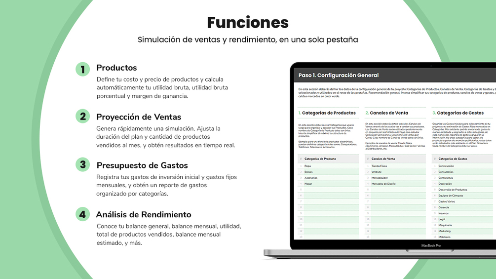 • ¿Buscas una herramienta más completa, que te permita crear un plan financiero detallado, registrar más productos, costos y gastos, alimentar tus ventas mensualmente y generar reportes exhaustivos? Entonces te recomiendo mi plantilla de Plan Financiero Avanzado.