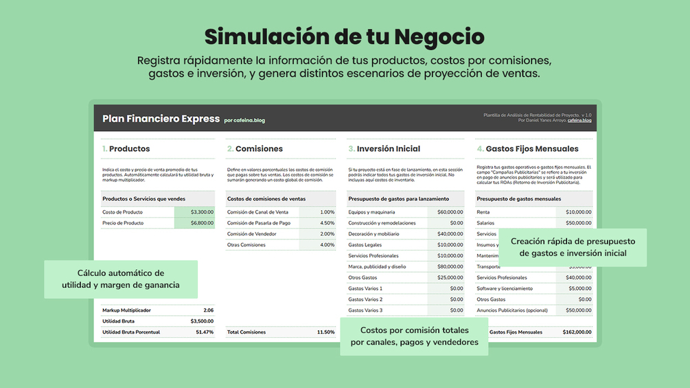 • Rellena paso a paso los datos de tu proyecto: No necesitas ser un especialista en finanzas, contabilidad o administración, simplemente sigue las instrucciones: define tu precio de productos, costos, comisiones, inversión inicial y gastos fijos mensuales. Solo debes llenar los campos resaltados en verde, y las fórmulas harán el resto.